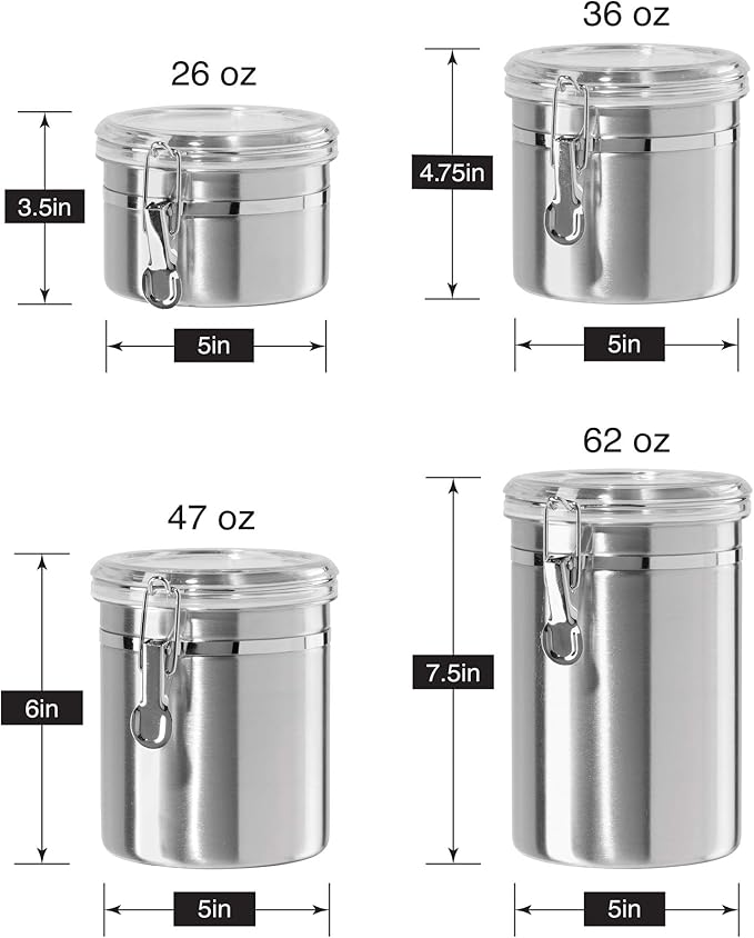 - BREADTH OF SIZES: The s/4 OGGI Stainless Steel Kitchen Canisters has a useful variation of sizes to suit your needs. Capacity: 26oz, 36oz, 47oz, 62oz.