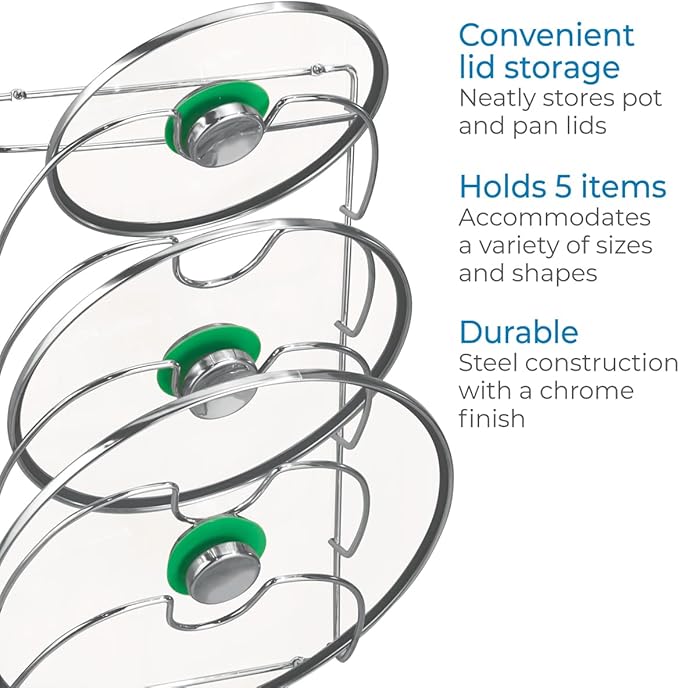 - HOLDS UP TO 5 POT OR PAN LIDS: Organizer rack stores lids with a variety of handle types such as round, ear knob, etc. Also great for holding Tupperware and other lids!