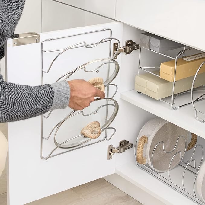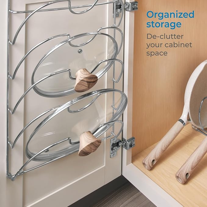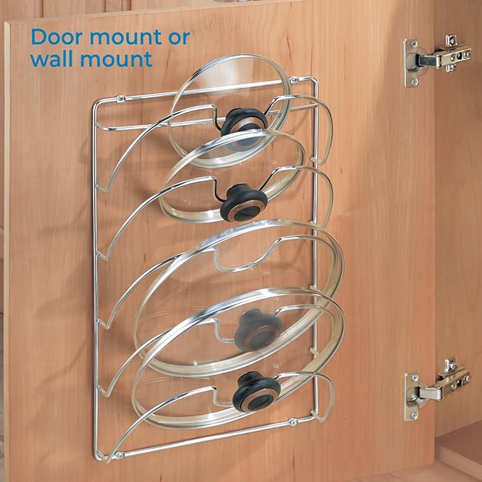 - LID ORGANIZING RACK: Kitchen storage rack is perfect for cabinets, pantries, walls, and other locations in your home. Hold plastic, glass, and metal lids. Save valuable pantry shelf space by storing your pot and pan lids on the wall