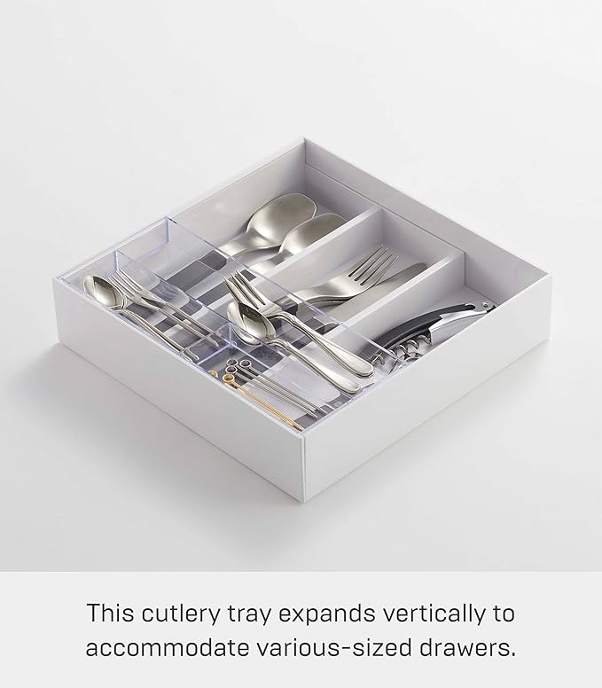 - CUTLERY ORGANIZER: This cutlery tray expands vertically to accommodate various-sized drawers. This insert keeps your kitchen drawers and countertops organized while having a place to divide spoons, knives, forks and other cooking tools.