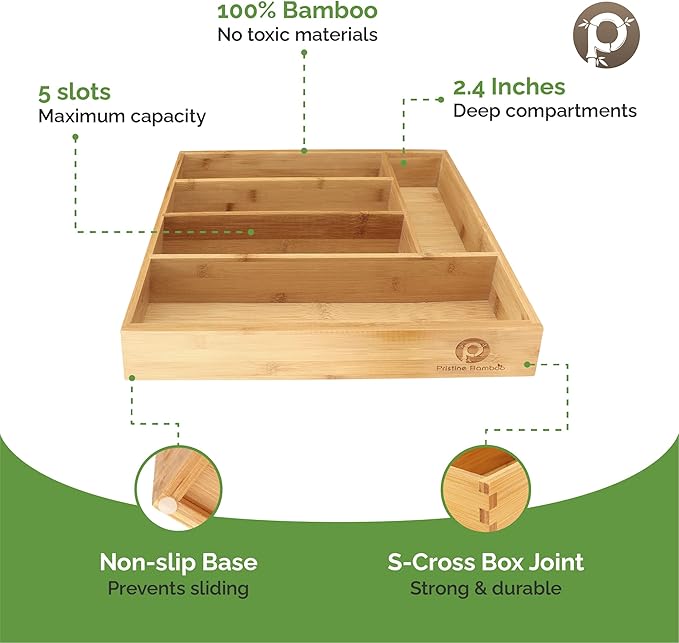 - SAFE FOR YOU & YOUR FAMILY: Our silverware holder is made up of the 100% highest quality Moso bamboo. We don’t use the toxic MDF bottom like other bamboo silverware organizers - that means our flatware holder is safe for you and your family. 100% bamboo offers naturally water-resistant properties.