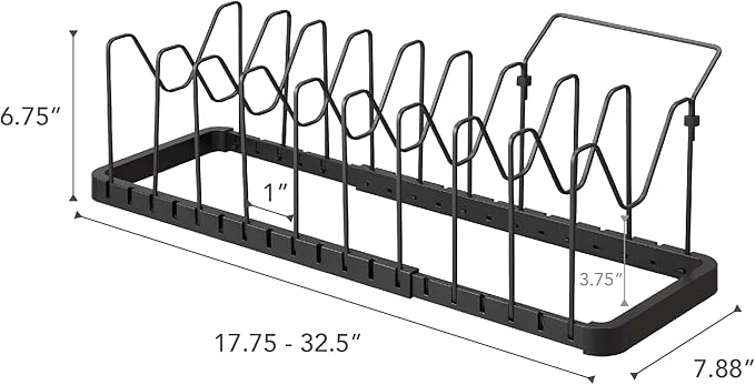 - 7 ADJUSTABLE DIVIDERS: Product comes with seven support pieces that easily lock into the base. Customize to accommodate any pot, pan, lid, pizza stone, aluminum baking trays, or even larger dishes.