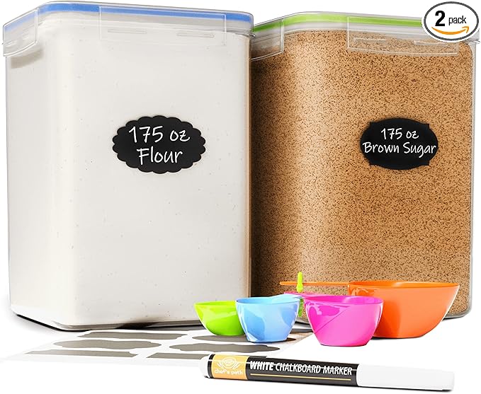 - Extra-Large 5.2L Food Storage Containers (2-Pack). Organize your kitchen and pantry storage with Chef’s Path. Perfect as flour sugar storage containers or rice storage containers, these bulk food storage containers hold up to 175oz of dry goods. -