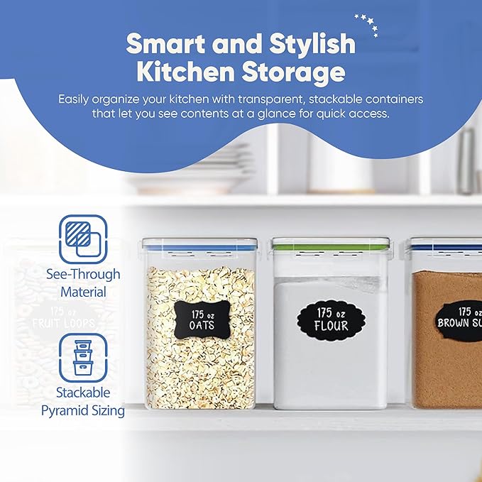 - Clear, Stackable & Space-Saving. Instantly see what’s inside. Used as snacks and rice storage or dry food storage containers and flour and sugar containers, these stackable pantry organizers free up space and keep kitchen countertops clutter-free.