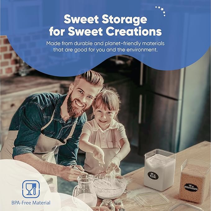 - Durable, BPA-Free & Stain-Resistant. Made from top quality, food-safe material, our plastic food containers resist stains and odors. Designed for daily use, our canisters for flour or sugar are dishwasher-friendly and perfect for pantry organization.