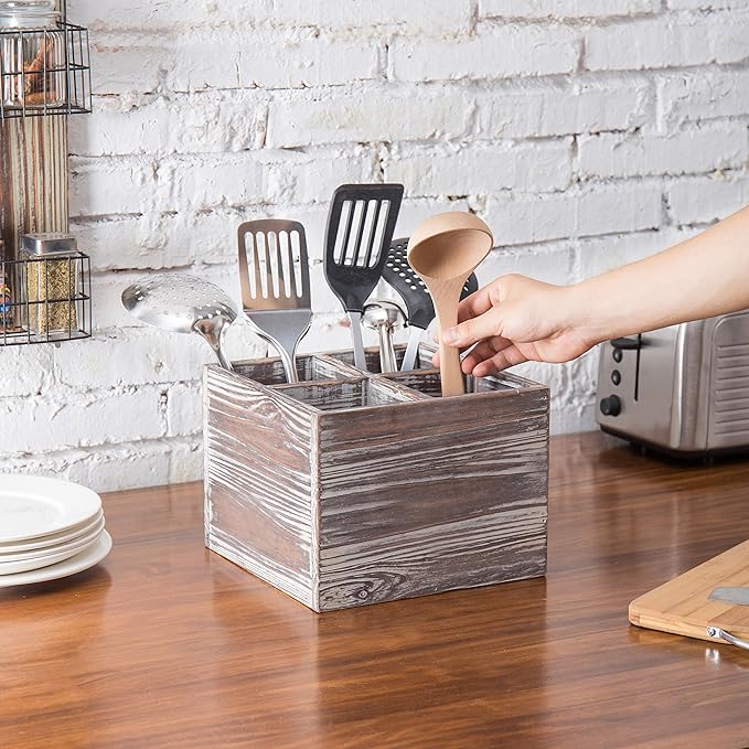 - Rustic distressed torched wood square countertop storage caddy with 4 individual wooden slots for holding and organizing cooking utensils or flatware