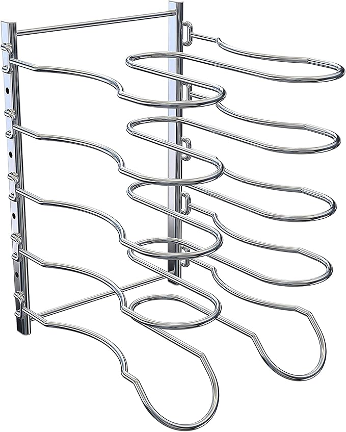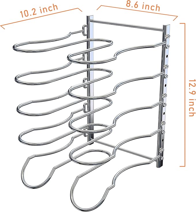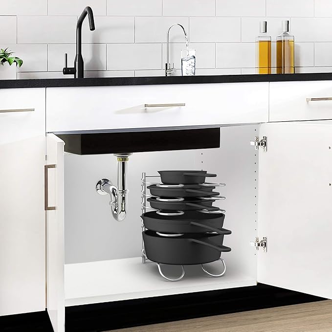 - POTS AND PAN ORGANIZER- Our organizer holds up to 5 pots or pans depending on the size to help maximize your kitchen space and allows for easier access
