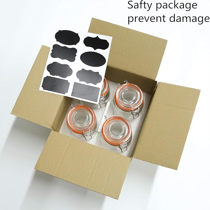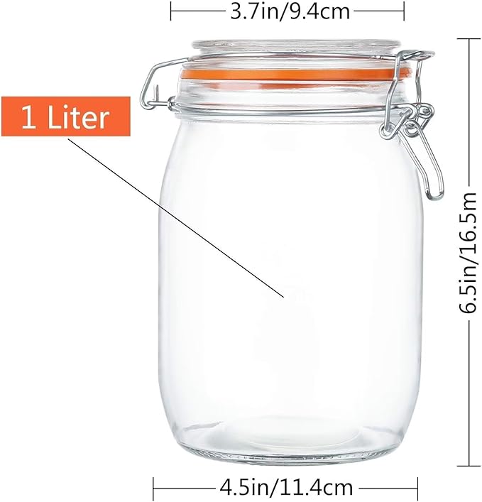 - Value Glass Food Storage Jar Set-Each set comes 4 pack of rounded glass jars in a safely package,measuring 3.70 inches opening width,4.50 inches bottom base and 6.50 inches height.These glass jars are made from high quality glass and feature a clamp lid with rubber gasket that secures the lid tightly in place,creating an airtight seal that helps to preserve the content fresh for longer and safe for longer periods of time.