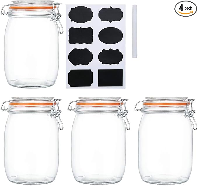 Encheng 32 oz Wide Mouth Mason Jars With Airtight Hinged Lids, Leak Proof Rubber Gasket - 1000ml Glass Storage Containers, Set of 4
