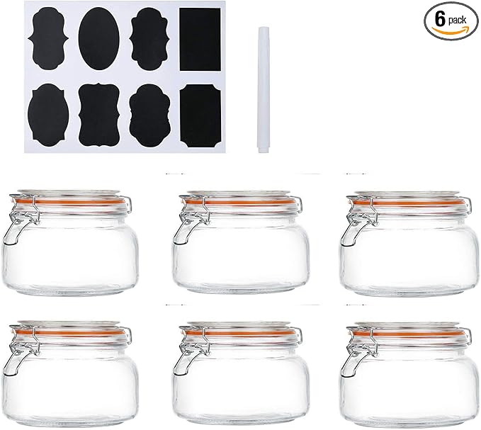 - ❤Complete Set: Comes 6 packs of airtight glass jars in a safty package,these16 oz glass jars are 3.8” tall and 4.5” wide, 3.6"wide mouth,use it to storage your home & kitchen and more now!comes with free stickers and a pen for free labeling,and an extra rubber seal ring replacement for each jar