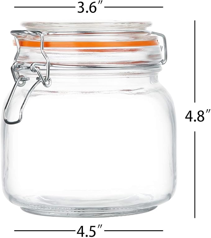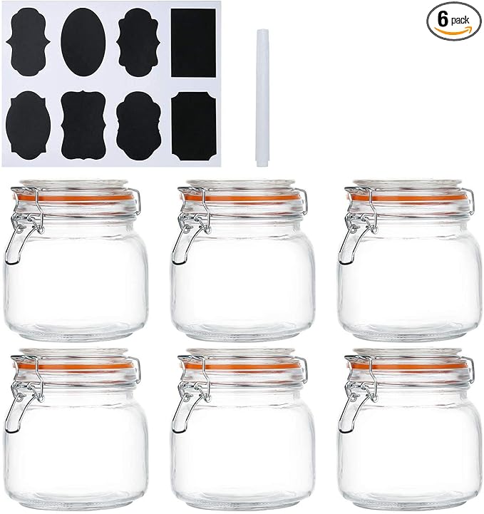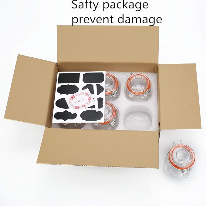 - Complete Set :Comes 6 packs of airtight wide mouth glass jars in a safty package,these 25 oz glass jars are 4.9” tall,4.3" at bottom,got gift pen and stickers,and an extra rubber seal ring replacement for each jar,use it to storage your home and kitchen now!make a organized neat home