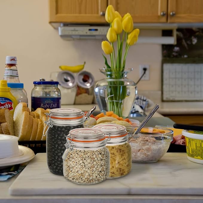 - Premium Glass-Airtight Seal:Made with excellent thick glass,heavy duty glass body and lids are airtight design,with rubber gasket hinged lids to ensure a leak proof and airtight seal,make sure your food never get bad,keep fresh and dry for longer! durable quality make it last for years.wide mouth design make its easy to put in and take out your storage,transparent body make you easy to check and grab what you want.