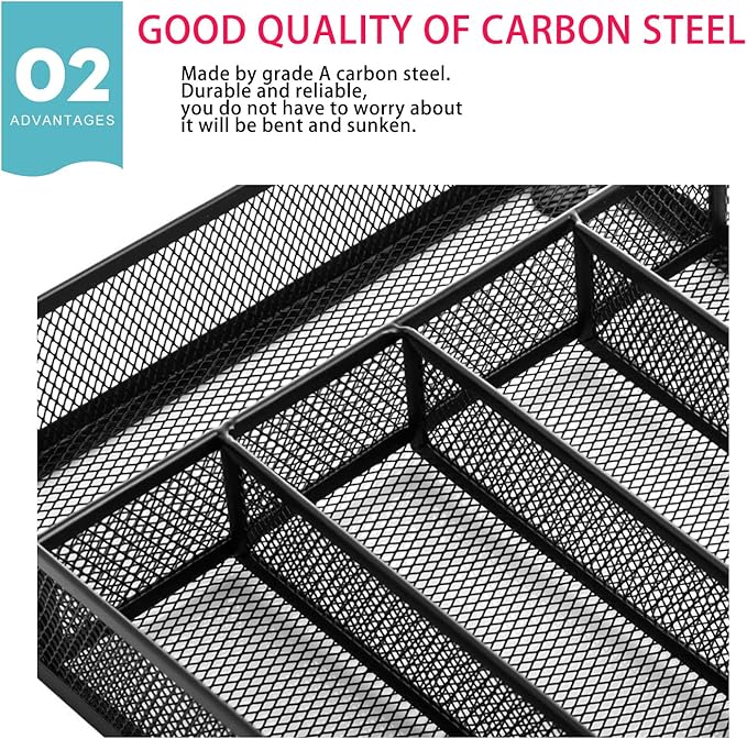 JANE EYRE Utensil Drawer Organizer, Cutlery Tray Silverware Flatware Storage Divider for Kitchen, Mesh Wire with Non-slip Foam Feet, 5 Component, Black