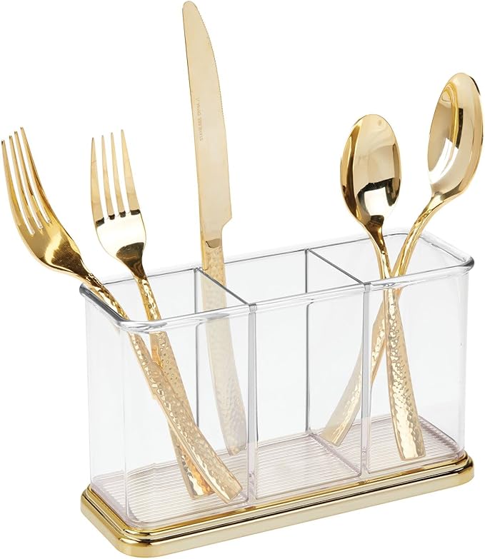 mDesign Plastic Cutlery Utensil Holder Storage Organizer Caddy for Kitchen Countertop Organization - Holds Fork, Knife, Spoon, Silverware - 3 Divided Sections - Hyde Collection - Clear/Soft Brass