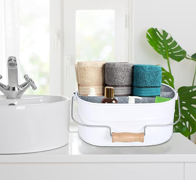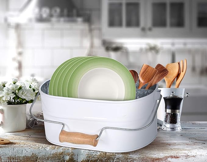 - PERFECT FOR EVERY PLACE : Anniversary, Holiday Housewarming or Birthday, Mother’s Day, wedding, bridal shower, or anything in between, this galvanized carry all makes a cute and functional gift. It looks great in the kitchen, living room, bedroom, office, bathroom or kid’s room. holding your hair brushes and curling irons in the bathroom, and even for cleaning supplies or gardening tools and accessories.Offering sufficient space, you can store your forks, spoons, kitchen gadgets, spatulas, utens