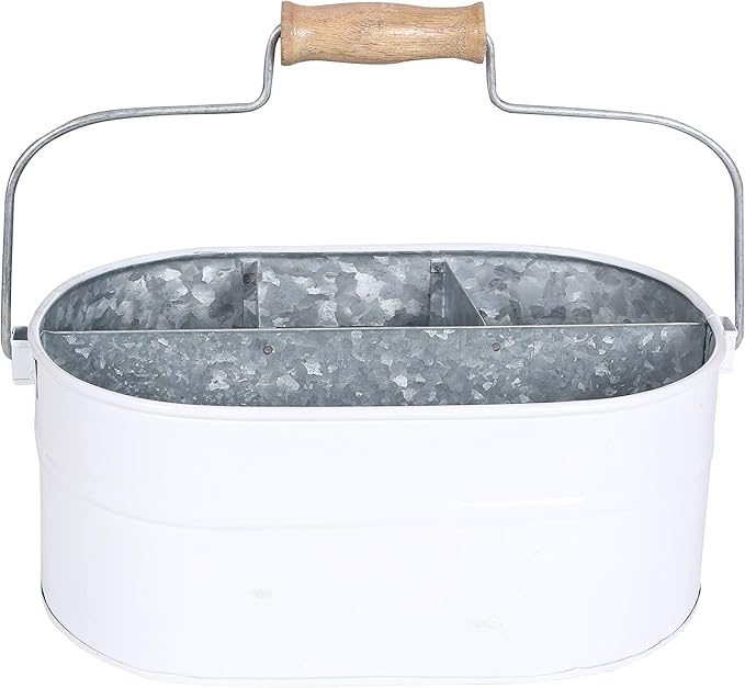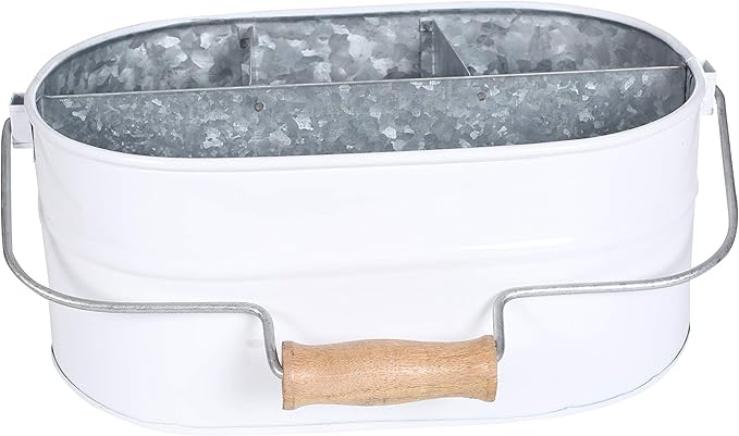 Light & Pro Farmhouse Rustic Silverware Utensil Carry All Caddy - Galvanized Organizer Caddy With Dividers, Wooden Handle Storage Bin For Flatware, Condiments, Party Cutlery - White