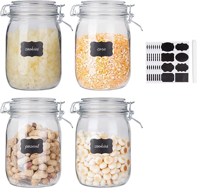 Glass Kitchen Storage Canister Mason Jars with Lids,32oz Airtight Glass Canister with Hinged Lid,Perfect for Kitchen Canning Cereal,Pasta,Sugar,Beans (Labels & Chalk Marker)-Set of 4