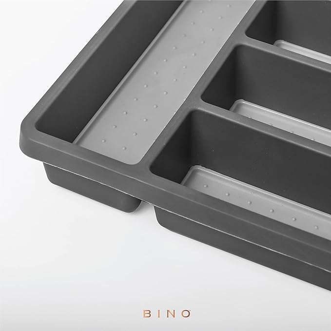 - Unique Organizer: The BINO utensil organizer has a soft grip liner that holds cutlery in place as the drawers are opened and closed. The liner also protects the 5-slot tray organizer from possible scratches caused by silverware. The spoon-and-fork organizer also has non-slip feet to make sure it does not slide around.