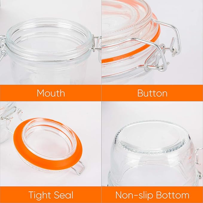 - ♥Classic Deisgn-Premium Quality:Made with excellent thick glass,heavy duty glass body with rubber gasket to ensure a leak proof and airtight seal to keep your food fresh for longer,mouse proof and keeps bugs and moisture out,durable quality make it last for years,vinegar-proof,suitable for chutneys and pickles,prefect decorate for small arts and crafts accessories and homemade gifts,wide mouth is easy to access and clean.prefect addtional to your kitchen and home.stock your home in a bright way!