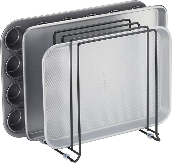 - 5 COMPARTMENTS: Streamline and organize your kitchen with this convenient cookware organizer rack; Organize and securely hold cooking pots, sauce pans, lids, cookie sheets, muffin tins and cutting boards; Use on a counter top, in a cupboard or even under the sink to reduce clutter; Reduce the risk of scratching and damage by keeping cookware separated into individual compartments; Save time - no more searching for the right pan or lid, it will be quick and easy to locate with this handy helper