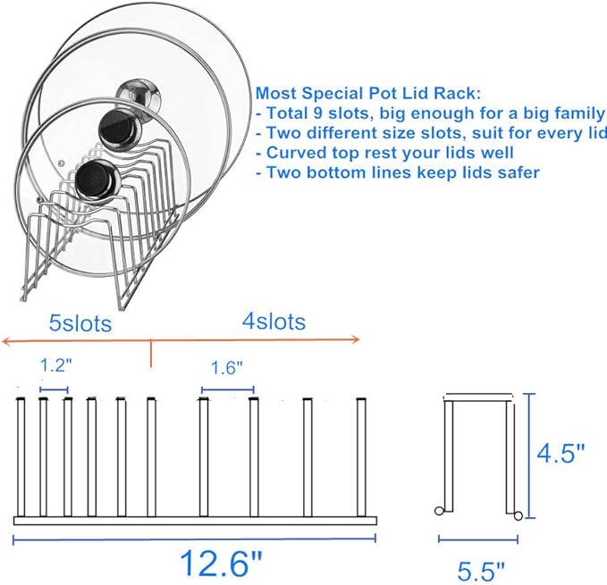 - Pot Lid Storage - Size: 4.3 x 11.9 x 4.1 inches; Slot width: 4 slots x 1.57" and 5slots x 1.18".