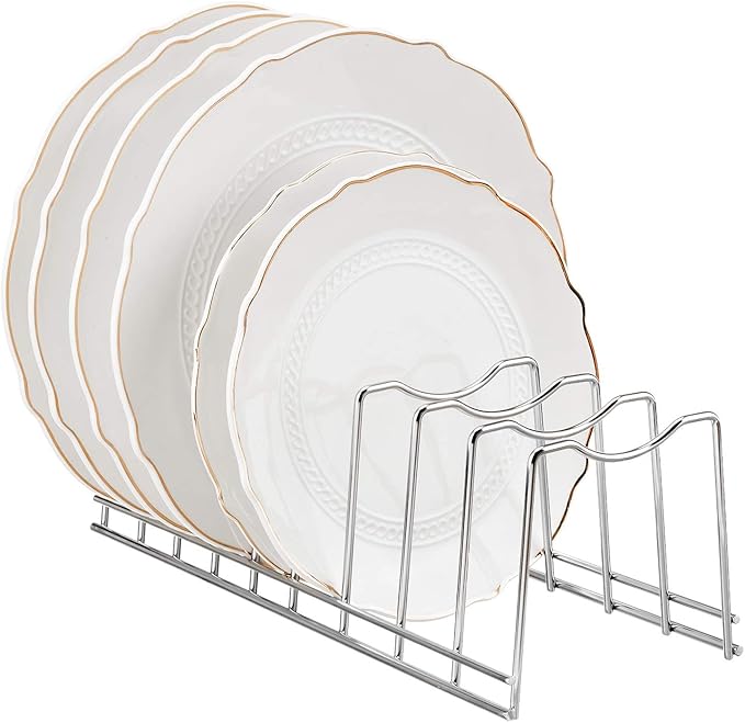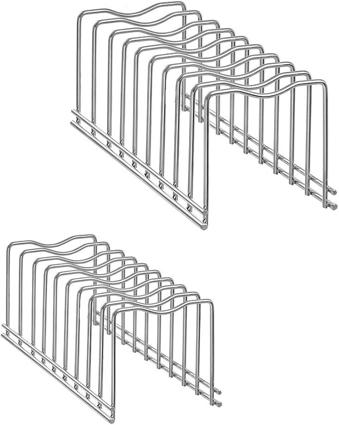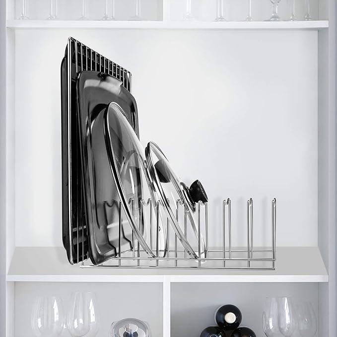 - Versatile- Perfect for pot lids holder; Also great for organizing your pans, dishes, cookie sheet, bakewares, cutting boards, baking pans or griddles; Suitable for your books, discs and files too. Keep your cabinets orderly, and the rungs separate the items to make it easy to grab the skillet or lid that you need without disrupting the stack.
