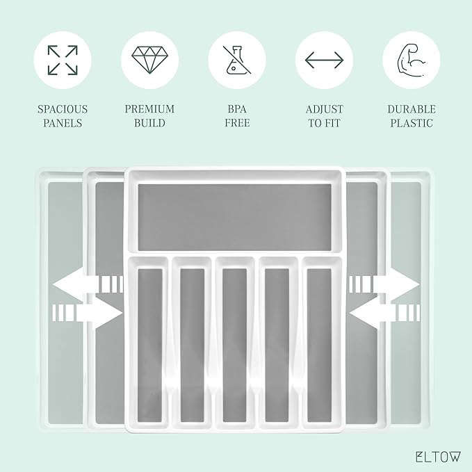 ELTOW Large Expandable Silverware Drawer Organizer, 8 Compartment Non-Slip & Adjustable Silverware Organizer for Drawer, Kitchen Organization for Utensils, Cutlery, Silverware Tray (White)