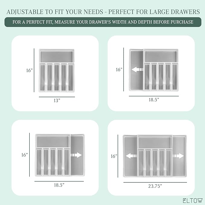 - Expands to 8 Compartments: Adjustable from 6 to 8 compartments; includes 5 small slots, 1 medium slot, and 2 expandable large slots on the sides; ideal for organizing forks, spoons, and other kitchen utensils