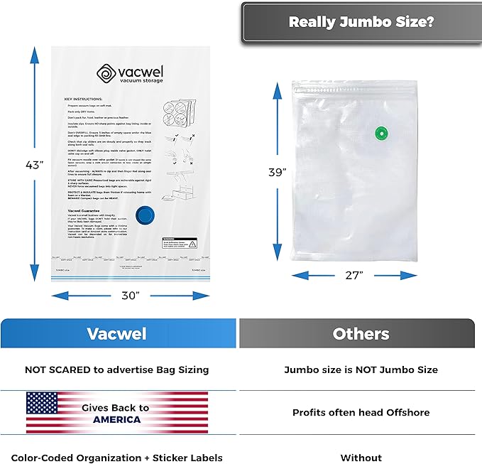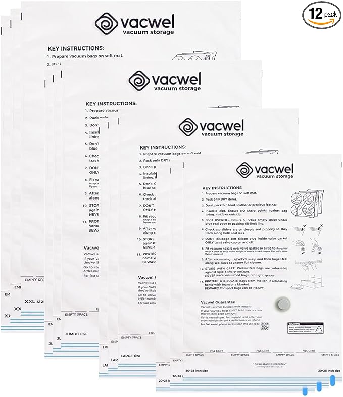 - QUALITY MADE AND DURABLE: Unlike other vacuum storage bags on the market that tear or lose their suction over time, Vacwel's bags are built to last. Made with an upgraded nylon lining for enhanced durability, these bags are thick yet flexible, striking the perfect balance between strength and flexibility. Plus, the unique colored caps and triple seal valves make it easy to find the bag size you want and ensure quality seal closures every time.