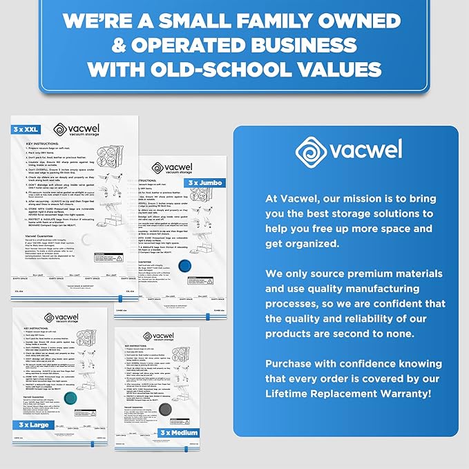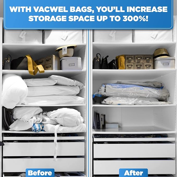 - EASY TO USE: With Vacwel's vacuum storage bags, you don't have to worry about your items getting damaged by dust or dampness. These ziplock bags vacuum compress using any standard vacuum cleaner nozzle, and once vacuumed, the compressed plastic bag will lock air out and prevent dust or dampness infiltration. Plus, with the double seal and airtight vacuum valve system, you can rest assured that your items will stay safe and secure, even during long-term storage.