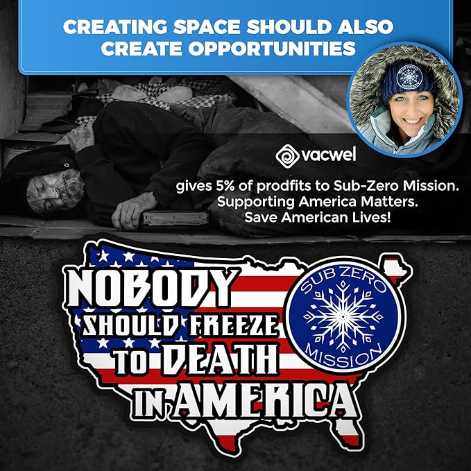 - GOODWILL: Creating space with Vacwel also creates opportunities! Vacwel gives 5% of sale profits to Sub-Zero, a charity that provide the homeless and disaster-stricken victims of America with essential needs to survive the cold.