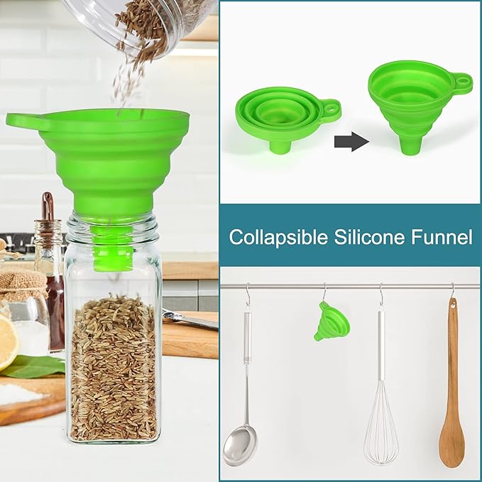 - PACKAGE INCLUDE :4 oz 48 Square Empty Glass Spice Jars, 48 Shaker Lids, 48 Silvers Metal Caps and 120 Blank Black Labels for Spice Jar ,1 Chalk Marker, 1 Silicone Collapsible Funnel and 2 Brush