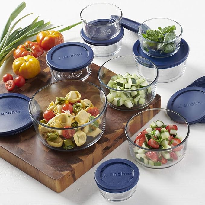 Anchor Hocking 18 Piece Glass Storage Containers with Lids (9 Glass Food Storage Containers & 9 Navy Blue SnugFit Lids)