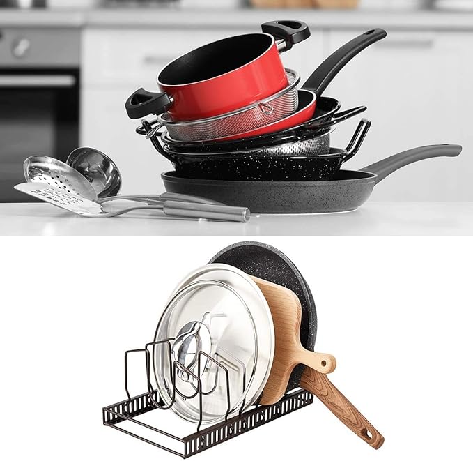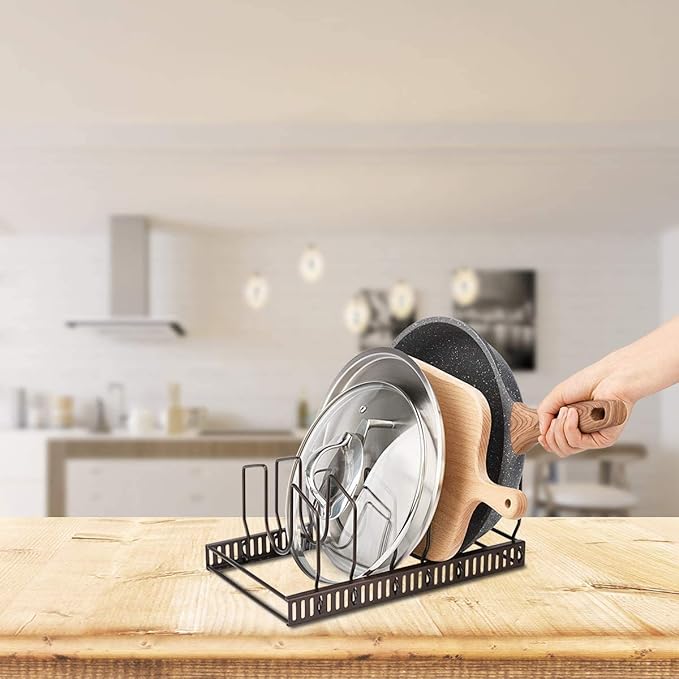Toplife Pot Lids Organizer Rack for Cabinet and Countertop, 7+ Pan Lids and Bakeware Organizer Rack Holder with 7 Adjustable Compartments - Brown