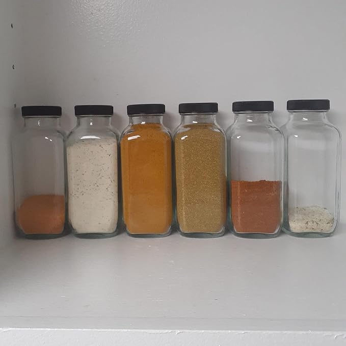 - Yarlung 12 pack 17oz French glass spice jar with black plastic lid, measures 2.6 x 6.7 inches in width and height.
