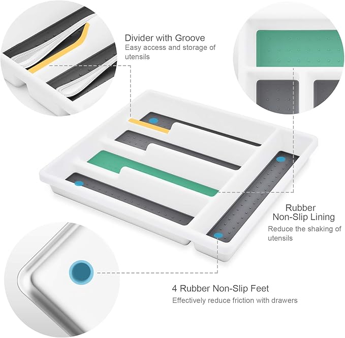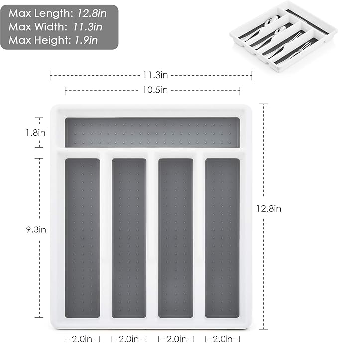 - DRAWER ORGANIZER - Made of high quality durable plastic, withstand normal wear for many years, Measures 12.8" x 11.3" x 1.9"(L x W x H), fits most drawers, 5 compartments provide suitable storage capacity, Rubber non-slip lining and rubber non-slip feet can better protect your cutlery and drawers