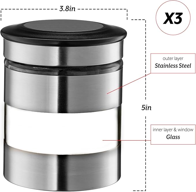 - COMES IN A CONVENIENT SIZE: Three canisters sized 3.8" Diameter, and 5" Tall.