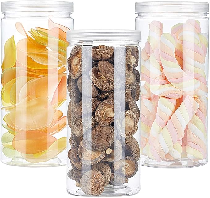 3 PCS 46OZ/1360ml Clear Plastic Round Storage Jars,Empty Plastic Jars with Lids,Clear Plastic Storage Jars with Screw on Lids for Dry goods,Noodles,Spices and More