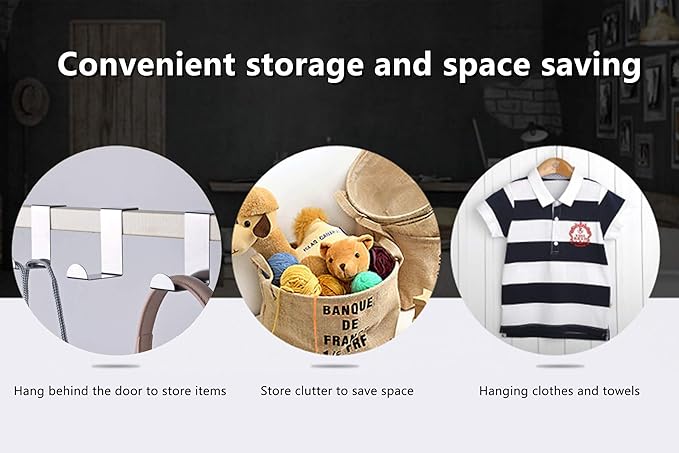 - Space Saving: Over door hooks make the most of the space behind the door for hanging and organizing backpacks, coats, umbrellas, purses, belts, towels, bathrobes etc.