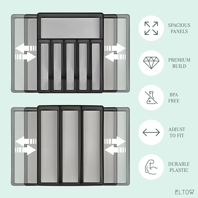 ELTOW Expandable Silverware Drawer Organizer & Utensil Tray Set, Non-Slip Kitchen Drawer Organizers and Storage, Kitchen Organization for Utensils, Cutlery, Office Supplies, Flatware Storage - Black