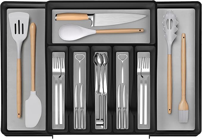 - Expandable Design: Expands from 6 to 8 compartments, featuring 5 small slots, 1 medium slot, and 2 expandable large slots for kitchen utensils; a must-have fork and spoon organizer