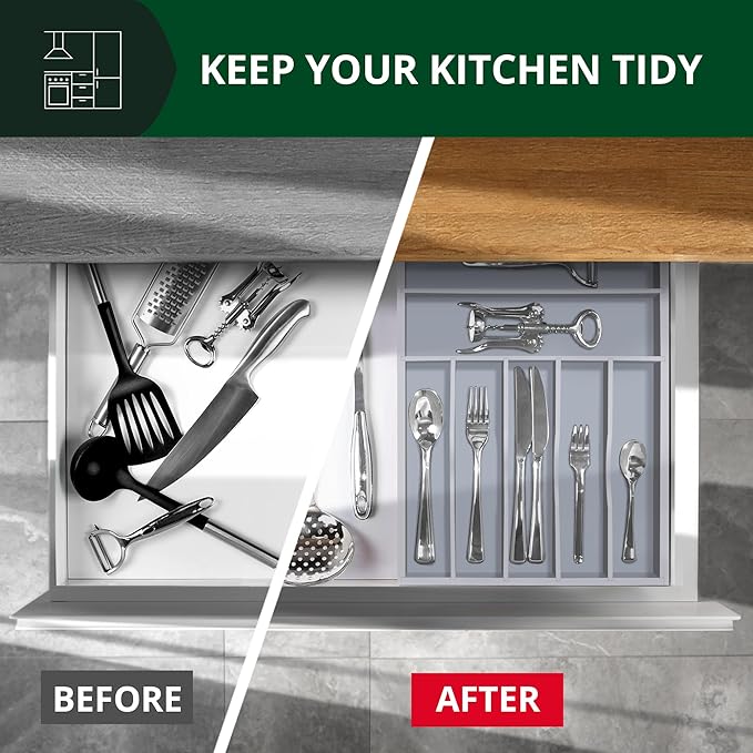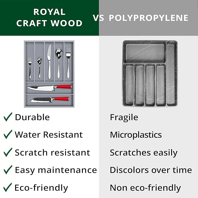- π§½ππππ ππ πππ, πππ πππππππππππ: Super easy to use, simply set the Royal Craft Wood Cutlery Tray with Drawer Organizers in your clean, empty drawer and fill with anything youβd like from kitchen utensils such as spoons, forks, tongs, spatulas, or steak knives to desk essentials like your stapler and staple refills, paper clips, erasers, and more. Easy to maintain, all you need to do is wipe clean with just a damp cloth, and your silverware drawer organizer will be as good as new