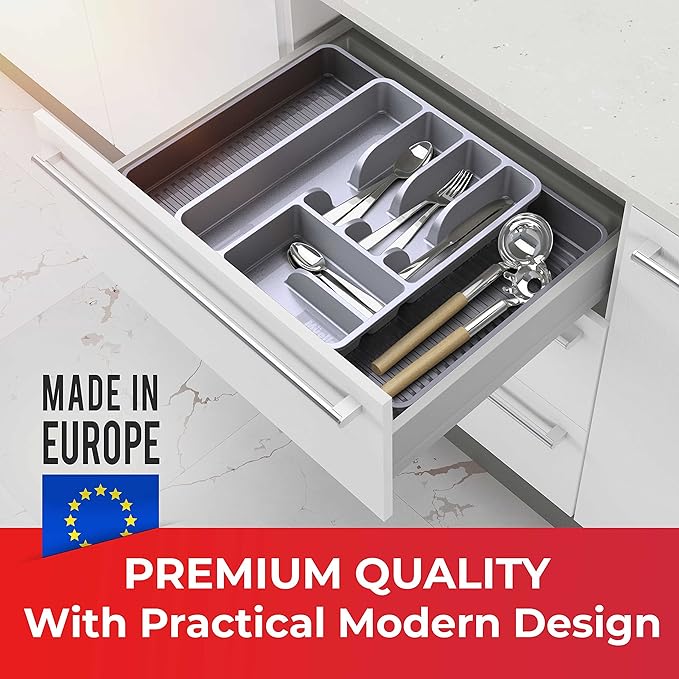 - Durable Design - The premium silverware tray is made of heavy-duty food-grade material for lasting quality. With rounded corners, the organizer will fit conveniently into drawers, or feature nicely on countertops. Smooth dividers make for carefree cutlery sorting and prevent unnecessary scratches on your flatware. Easily maintain by simply wiping clean or placing in the dishwasher.
