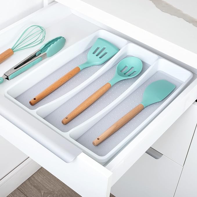 Smart Design 3-Compartment Plastic Drawer Organizer - Non-Slip Lining and Feet - BPA Free - Utensils, Flatware, Office, Personal Care, or Makeup Storage - Kitchen - White with Gray