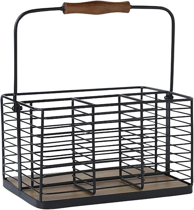 - [WOODEN GRIP HANDLE & WOODEN BOTTOM] Convenient handle for carrying the steel silverware tote caddy with ease. Wooden bottom for extra stability and keep balanced when loaded. Ensuring the safety when carrying the flatware organizers caddy bin in and out.
