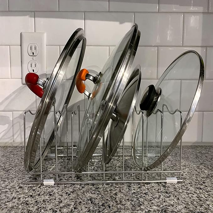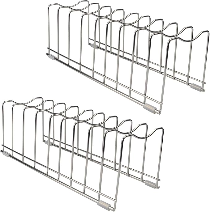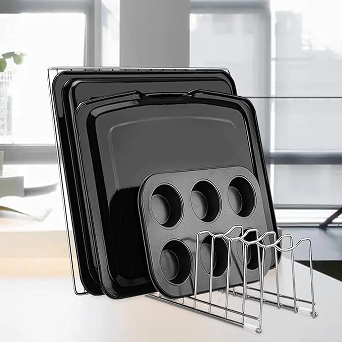 - 【Sturdy and Rust-proof】: The lid organizer is made of sturdy stainless steel, rust-proof and durable. It can supports heavier pans, baking pans and cutting boards and does not deform.