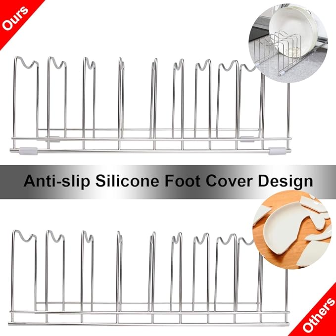 - 【Enhanced Version】: Our pot Lid Organizer is equipped with four silicone feet, which can prevent noise when rubbing against the surface of the table and play the role of non-slip.