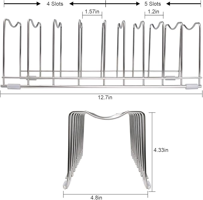 - 【Multiple Size】:The pot lid rack overall dimensions 12.59 x 4.72 x 4.33 inches, each compartments width: there are 4 x 1.57 inch and 5 x 1.18 inch to fit your different needs.