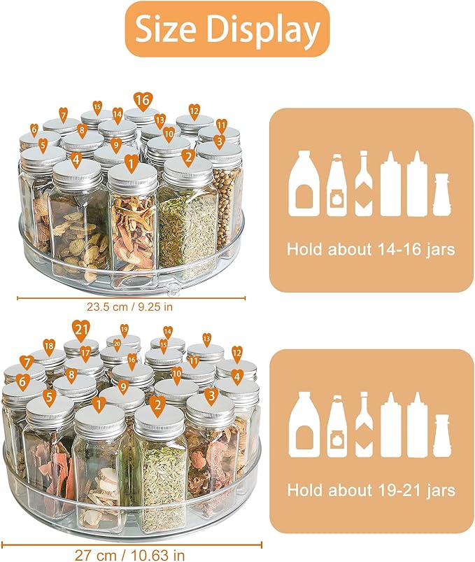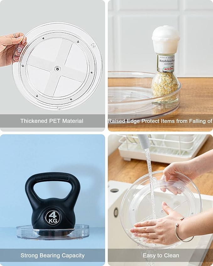 - The clear PET material makes the items you put on the turntable more visible, the raised edge keeps the items from falling off.