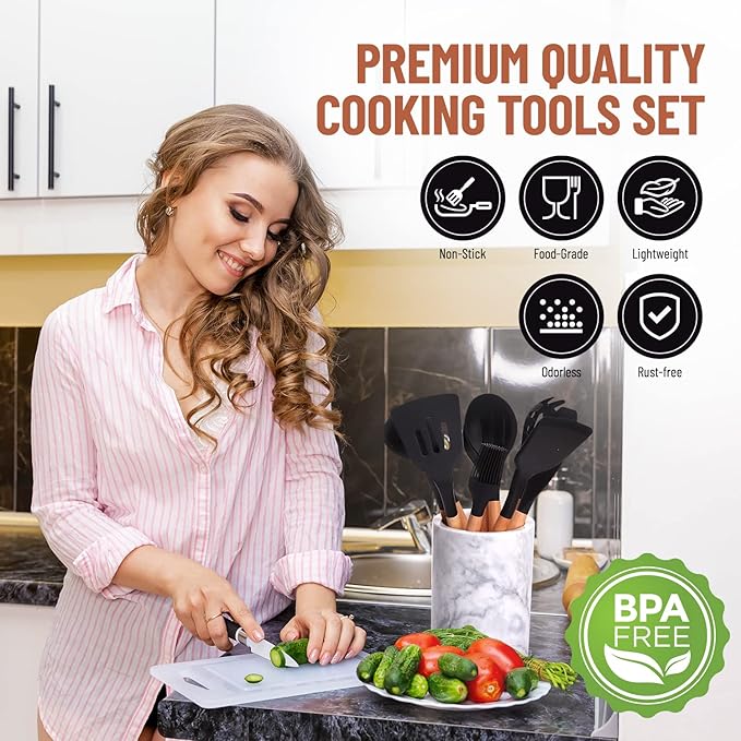 Homeries Marble Utensil Holder Set - Utensils Included - Flatware & Utensil Storage Organizer for Countertops, Pantry, Bathroom, Office & Center Table - Stylish Kitchen Counter Decor